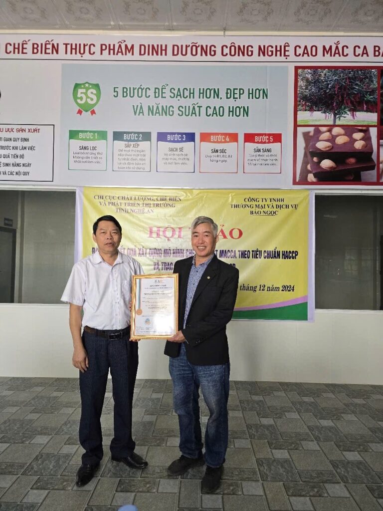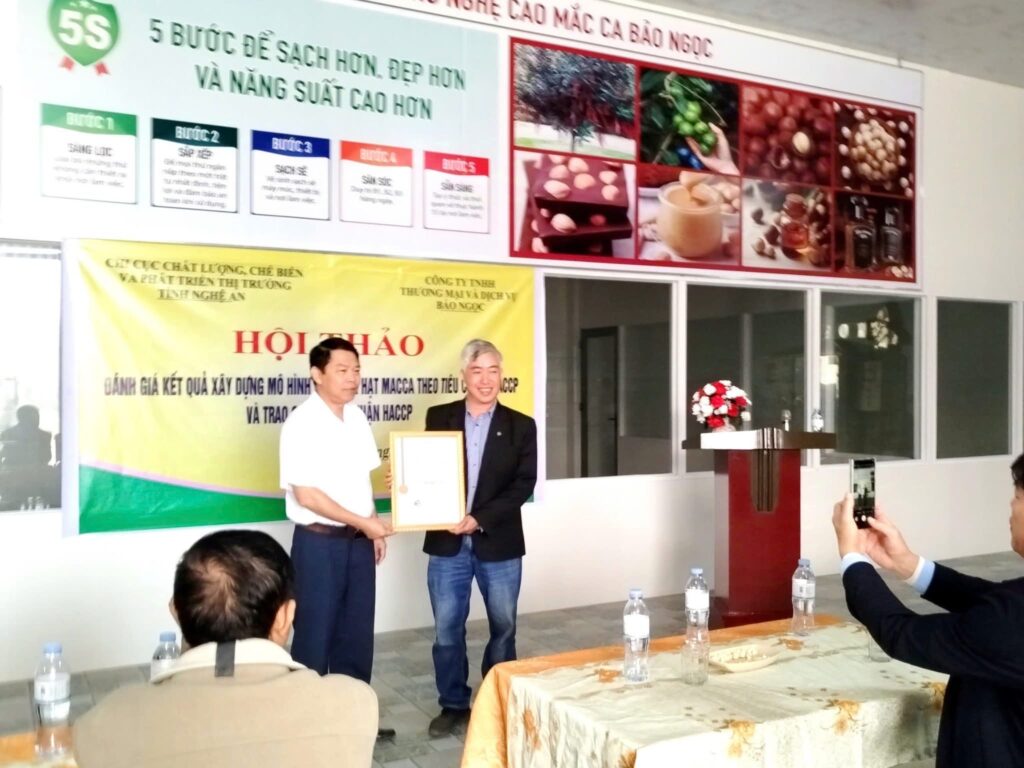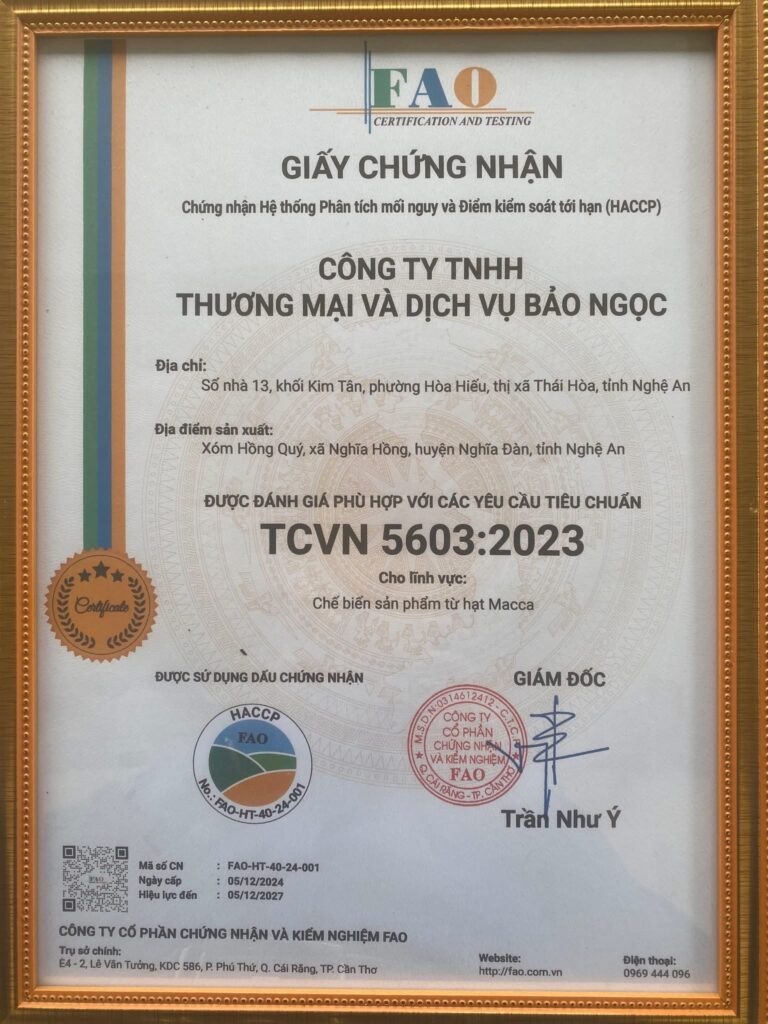 Ngày 10/12/2024, Chi cục chất lượng, chế biến và phát triển thị trường Nghệ An (trước đây là Chi cục quản lý chất lượng nông lâm sản và thuỷ sản) đã tổ chức hội nghị tại Công ty TNHH TM&DV Bảo Ngọc để trao cho Công ty Giấy chứng nhận HACCCP cho các sản phẩm chế biến từ macca – đánh dấu sự thành công đáng tự hào sau chặng đường 5 năm đầu tiên phấn đấu cho thương hiệu macca Bảo Ngọc, là thương hiệu gần đây đã được Tổng hội Nông nghiệp và PTNT Việt Nam trao Chứng nhận là Thương hiệu vàng nông nghiệp Việt Nam năm 2024.